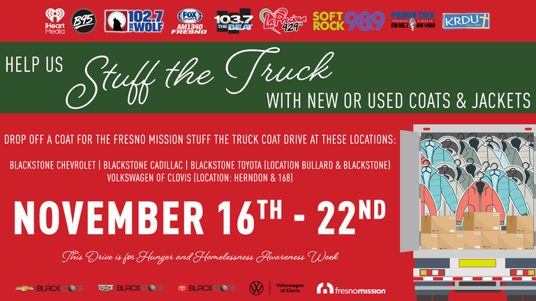 EVERY DAY CAN BE A STRUGGLE FOR THOSE FACING LIFE INSECURITIES. DROP OFF A COAT/JACKET AT THE FRESNO MISSION STUFF THE TRUCK COAT DRIVE, NOVEMBER 16 TH THROUGH THE 22nd, AT BLACKSTONE CHEVROLET, BLACKSTONE CADILLAC OR BLACKSTONE TOYOTA AT BULLARD AND BLACKSTONE.  OR VOLKSWAGEN OF CLOVIS AT HERNDON AND 168.